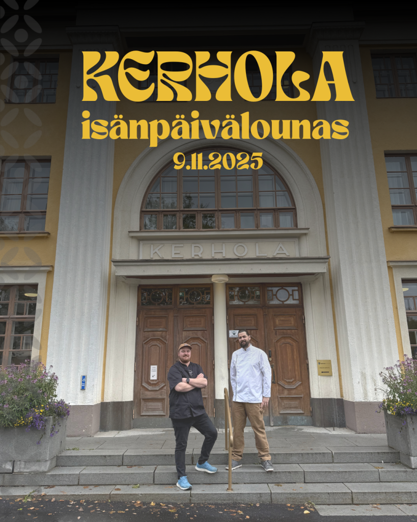 Syksyisiä makuja Kerholassa tarjoilee nokialaiset Keittiömestarit Ilkka Isotalo & Janne Salonen. Lounaalla alkuruoka on tarjolla herkullisesta buffetista, josta löytyy monipuolisesti erilaisia makuja, ja pääruoka tarjoillaan pöytiin.